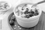 Plant based organic yogurt made from almond milk topped with gluten free granola and fresh blueberries