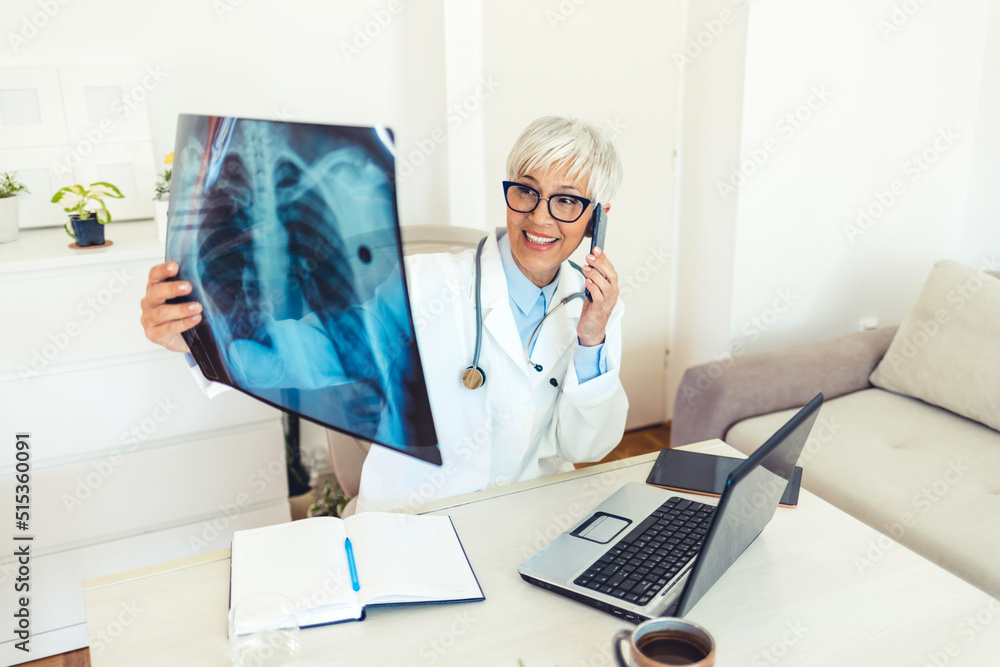 Senior doctor with smartphone looking at chest x-ray in her office. Female doctor examining an x-ray, talking on the phone.