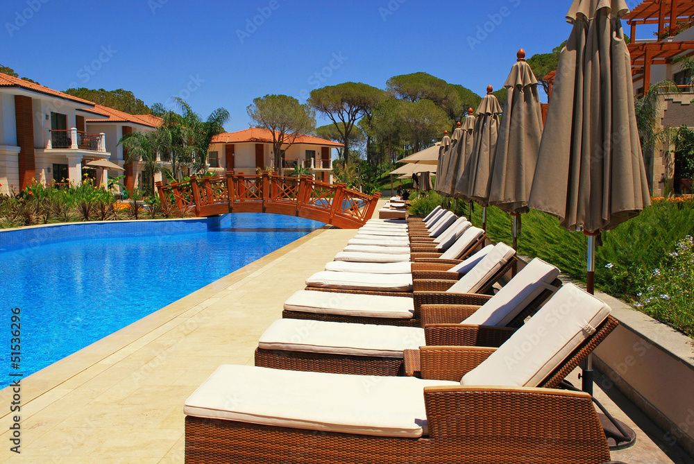 Beautiful poolside with line of chaise longues