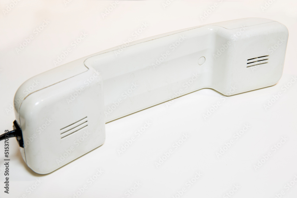 Closeup of a white corded telephone handset on white background. Communication concept.