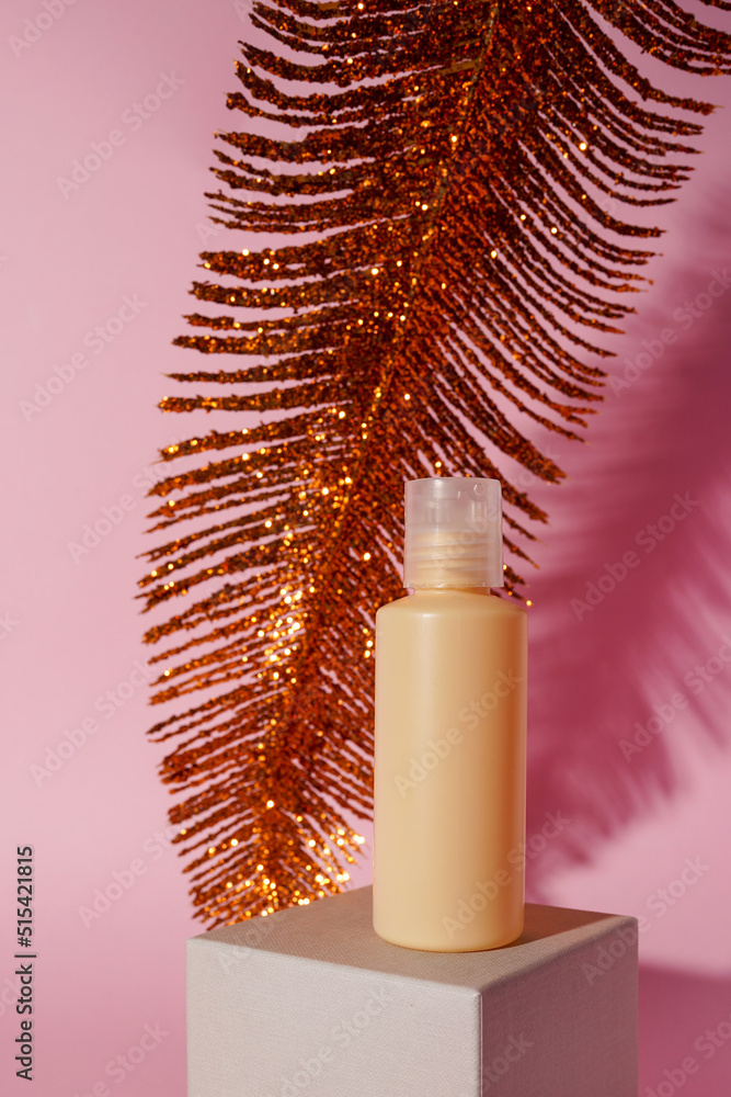Mockup of yellow container for cosmetics, cream, serum, gel on yellow background with pink feather. Copy space