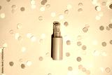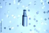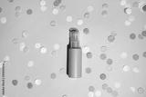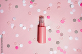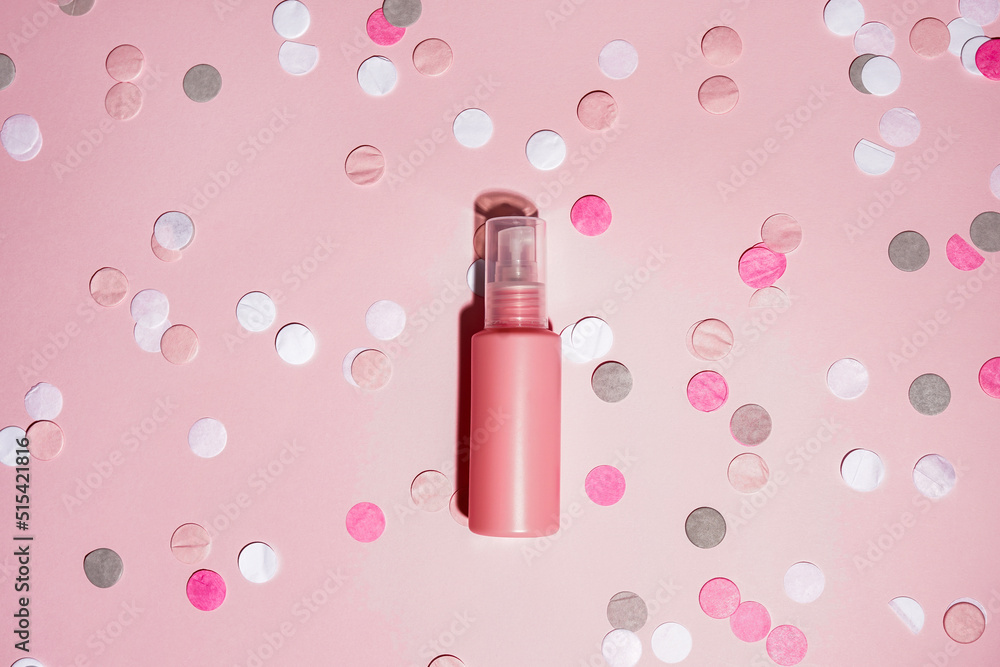 Pink cosmetic bottle with shadow on pink background with colour confetti, mockup. beauty spa medical skincare and cosmetic lotion cream packaging product