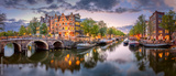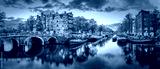 Amsterdam. Panoramic view of the downtown of Amsterdam. A blue evening time and the serene reflection of lights in the water. Europe, Netherlands, Holland, Amsterdam.