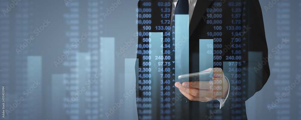 Businessman plan graph growth and increase of chart positive indicators on smartphone