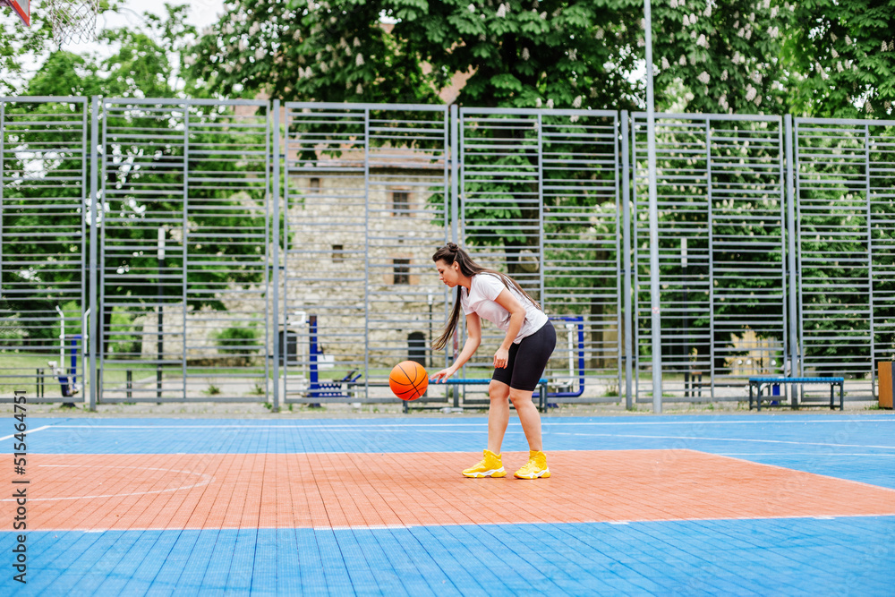 Young athletic woman is training to play basketball on modern outdoor basketball court.