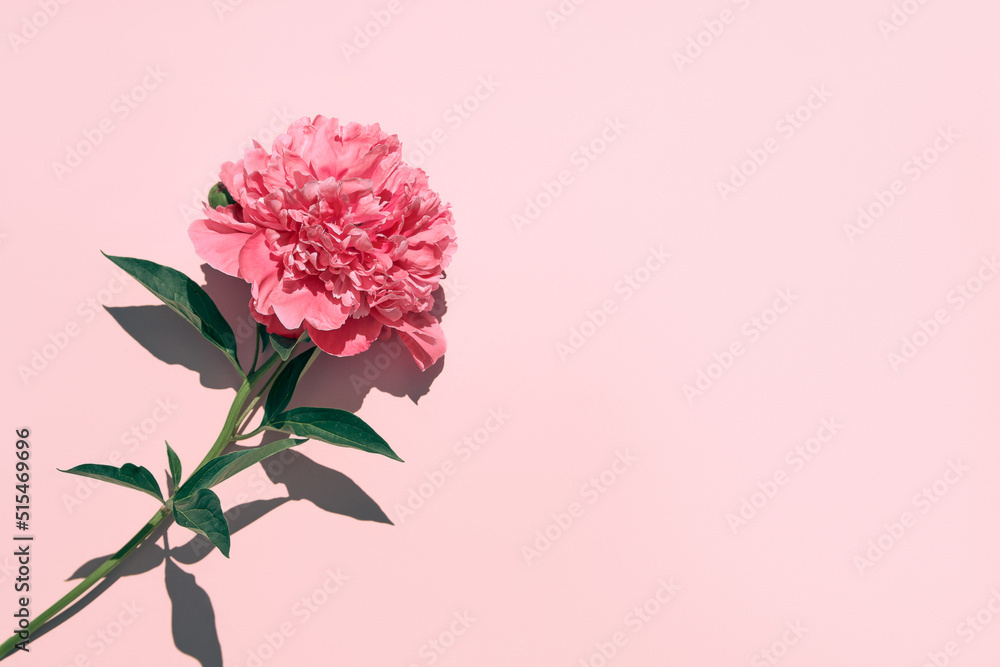 A beautiful pink peony flower on pastel pink background with hard shadow. Top view, flat lay, flowers minimal concept. Copy space. Mock up for any project.