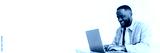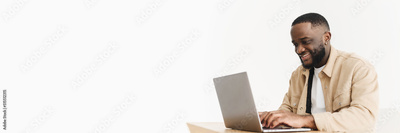 Web banner. Smiling professional black business man using laptop computer working from home office. Happy afro american freelancer man working at home