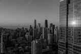 Drone, aerial view of a Chicago Skyline and Lake Michigan during sunset