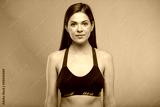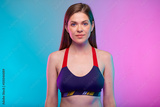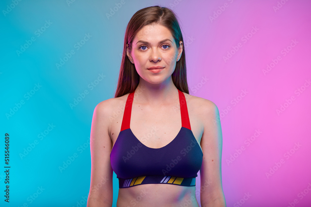 Serious sporty woman in fitness sportswear . Female fitness portrait isolated on neon multicolor background.