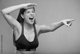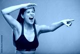 Strict sporty coach woman in fitness sportswear looking for new new aspiring athletes. Female fitness portrait isolated on neon multicolor background.