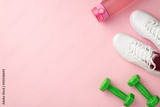 Fitness concept. Top view photo of white sports shoes pink bottle of water and green dumbbells on isolated pastel pink background with empty space