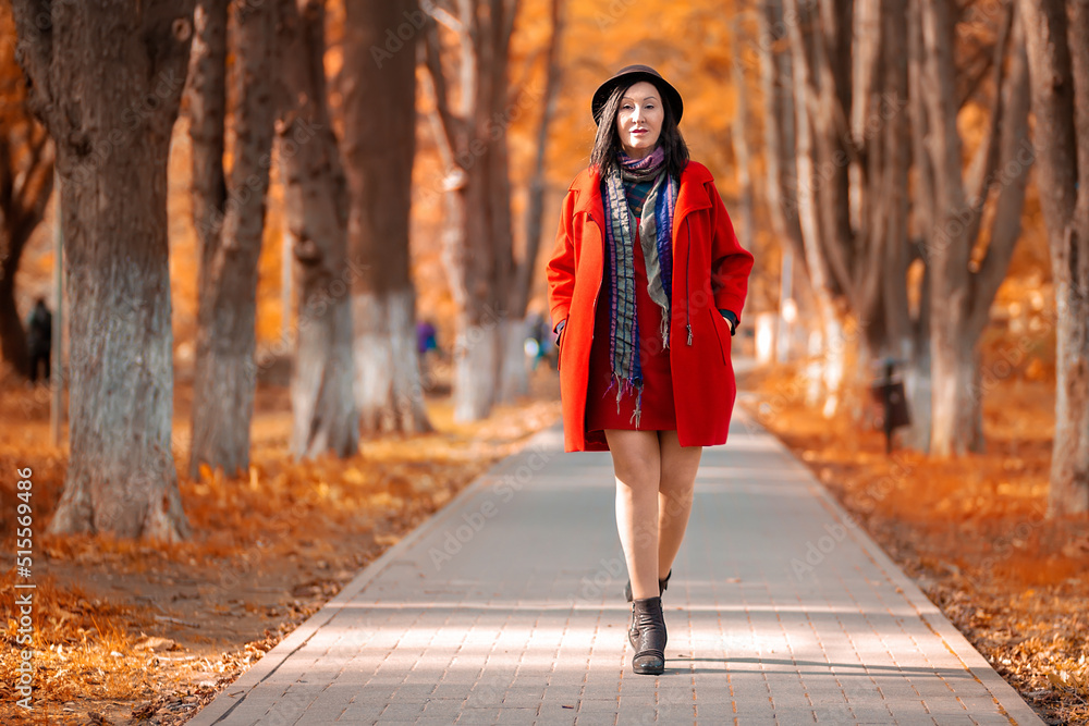 Elegant beautiful adult woman in a red coat and hat walks along the path of the autumn Park