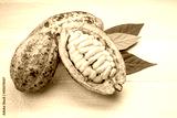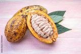 Fresh cocoa fruits with green leaf on pink wooden background.