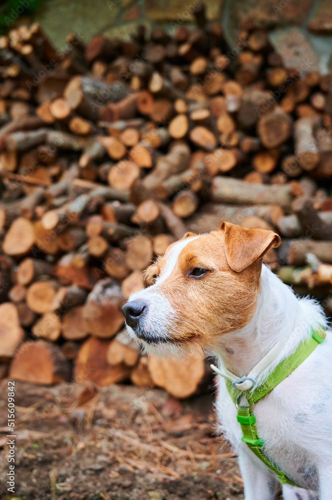 Close up of Parson Russell Terrier while poses in front of a wall of chopped firewood at countryside for advertisement photoshoot.