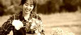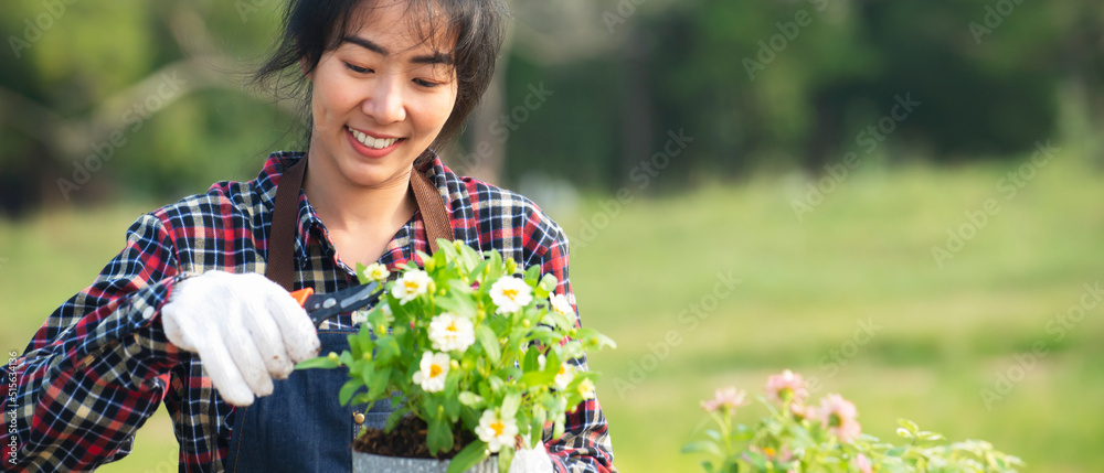 Portrait of asian woman wearing gloves cut flowers at outdoor
