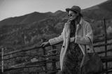 Fashionable woman wearing trendy autumn outfit with orange hat, glasses, faux fur coat, holding trendy brown suede bag, posing in mountain landscape. Copy, empty space for text
