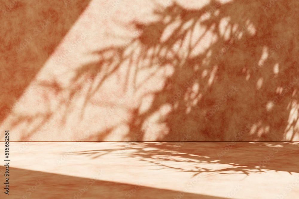 Concrete wall background with plant shadow. Summer tropical architecture scene. Product placement display on rustic cement texture stage.