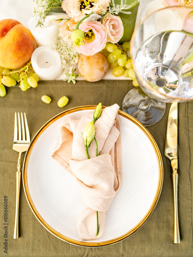 Festive colourful table setting. Restaurant, wedding, party decorated with flowers, candles, fruits and leaves. Midsummer or autumn mood event, romantic dinner. Florist decorator occupation.