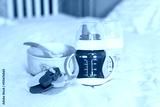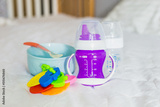 A set of baby dishes on a white bed. Plate, spoon, bottle for water on bed linen. Baby feeding, food
