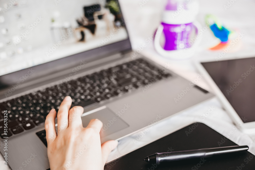 woman holding her hand on touchpad with laptop monitor open screen
