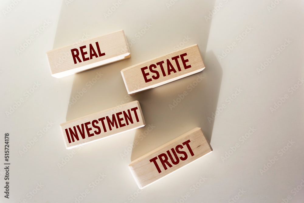 REIT investment fund symbol. Conceptual words REIT real estate investment fund on wooden blocks on a white background. Real estate investment trust REIT business concept.
