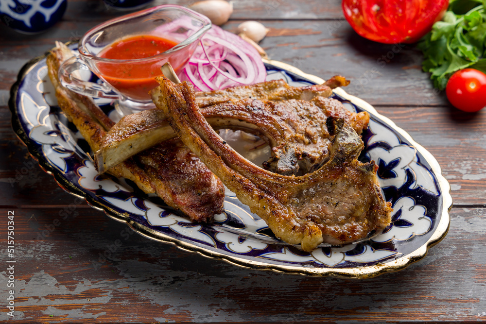 rack of lamb kebab with red onion and tomato sauce on wooden table