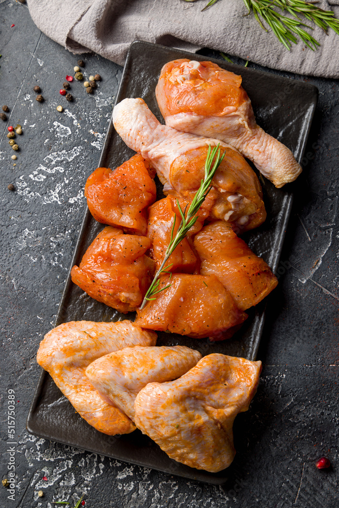 raw marinated chicken for barbecue, chicken fillet, chicken wings, chicken legs on dark plate top view on dark stone table, vertical