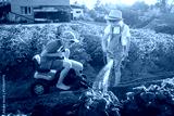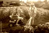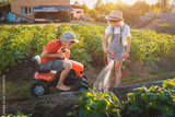Sibling children frolic splashing with a water hose in the backyard in the garden on summer holidays in the village on a hot day