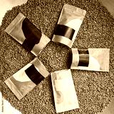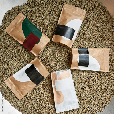Green coffee beans with coffee packages in grinder