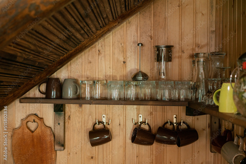 The vintage rustic interior of a country house kitchen with many glass cups on the shelf. Wooden wall. Equipment. Nobody. Object. Style. Wall. Cooking. Group. Indoors. Luxury. Setting. Furniture