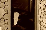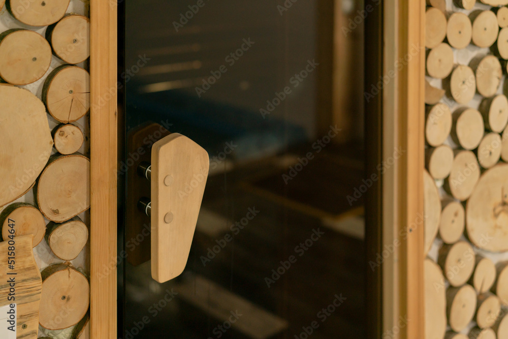 Glass entrance door to the sauna with wooden handle and wooden wall. Luxury. Bath. Lifestyle. Nobody. Comfortable. Relaxing. Seating. Warming. Treatment. Warmth. Shower. Heater. Bathe. Steamy