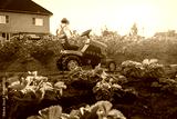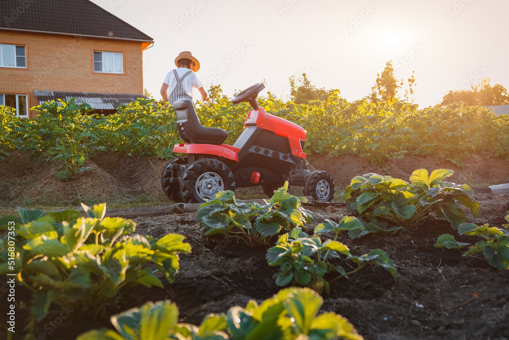 child girl admires the sunset standing on a pedal tractor in the backyard in the garden in the village.