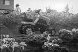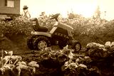 child girl admires the sunset standing on a pedal tractor in the backyard in the garden in the village.