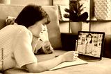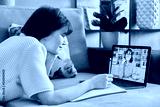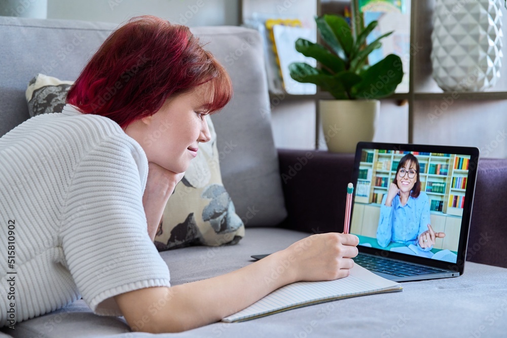 Teenage student at home looking to online lesson, teacher on laptop screen