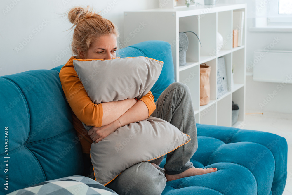 Unhappy lonely depressed woman home, she sitting couch hiding her face pillow, depression concept