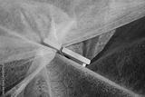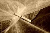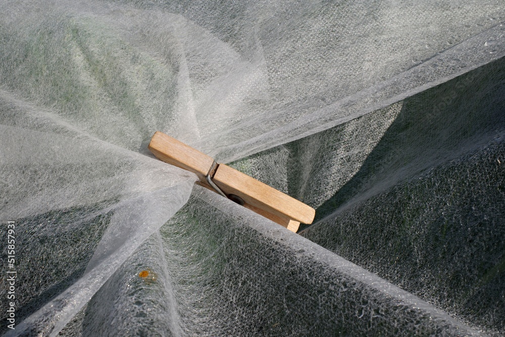 Pieces of synthetic fabric are connected by a wooden paper clip on a summer day