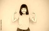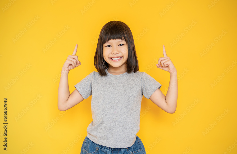 Portrait of young fun smart happy little cute asian girl isolated on yellow with copy space studio shot. Education for elementary kindergarten, little girl finger point up back to school concept