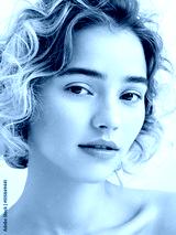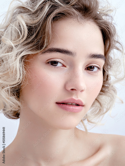 Close up portrait of a cute young girl in a soft daylight . Charming model with bare shoulders, clean fresh skin and cute curls on white background. Natural feminine beauty. Natural make-up.