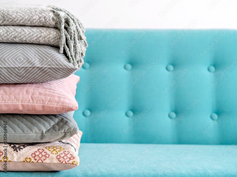 Stack of colorful pillows on turquoise sofa. Pile of soft green and pink cushions and woolen blanket on top with space for text. Modern and cozy home concept.