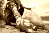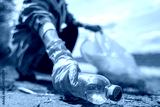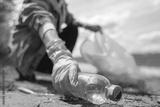 A young woman in yellow gloves collects abandoned garbage in a black bag in the forest. Plastic pollution and environmental protection