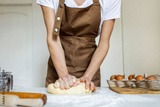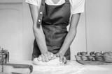 A woman in a special apron cooks at home. Rolling out and preparing dough for baking.