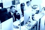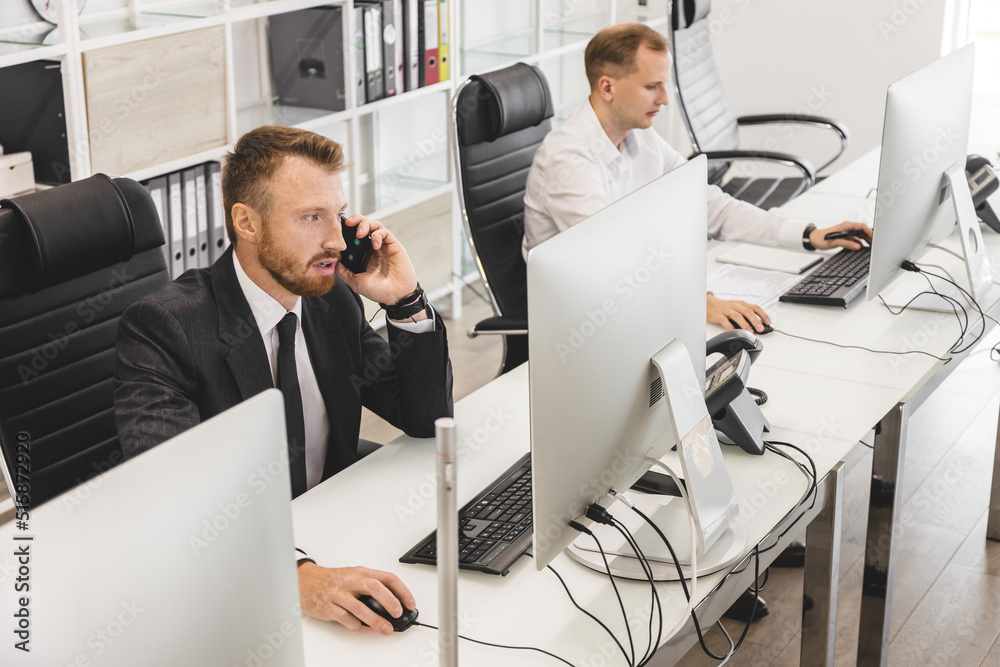 Employees of the company work at computers in the office. Interaction in the process of work and problem solving. Workplace in modern business space