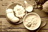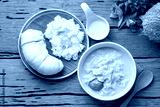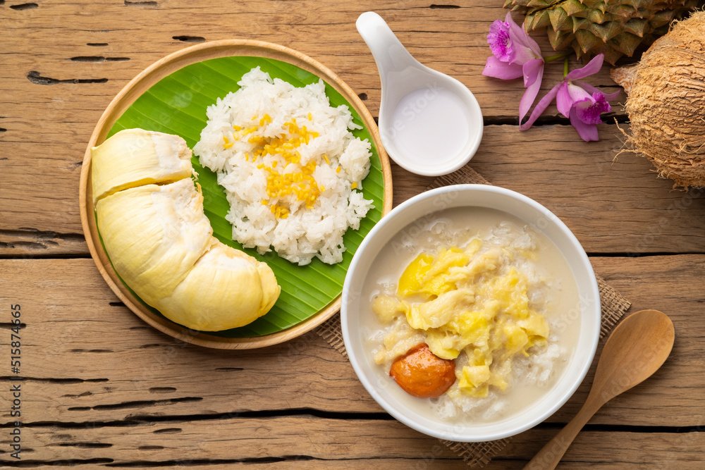 Thai sweet food,Cooked sticky rice in sweet coconut milk with Durian fruit in white bowl,popular dessert in Thailand.Top view