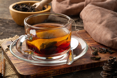 Black tea,Tea bag in hot water in glass cup on wooden table