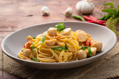 Stir-Fried pork meatballs with Spaghetti and holy Basil in a plate.Fusion food