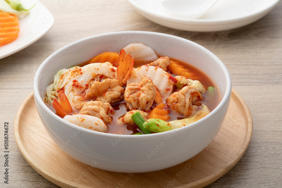 hot and spicy soup with mixed vegetable(radish,yardlong bean,Katuri Flower,carrot,cabbage) and Shrimp in white bowl.Thai traditional healthy menu and diet food.
