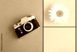 Old camera, white chamomile and yellow square for text on the gray background. Top view. Copy sace.