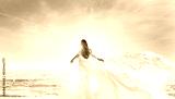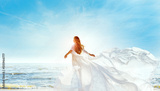 Model in White Dress Flying on Wind. Happy Woman Enjoying Sun looking away at Blue Sky. Carefree Girl dreaming at Sea Beach Resort. Freedom and Spiritual Relax Concept