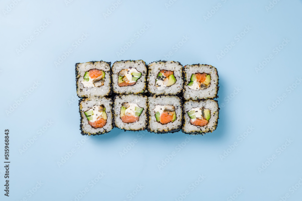 Philadelphia roll with eel and salmon with black masaco on blue background