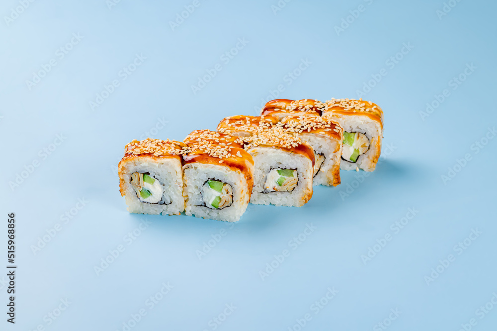 roll Canada with eel and avocado on blue background